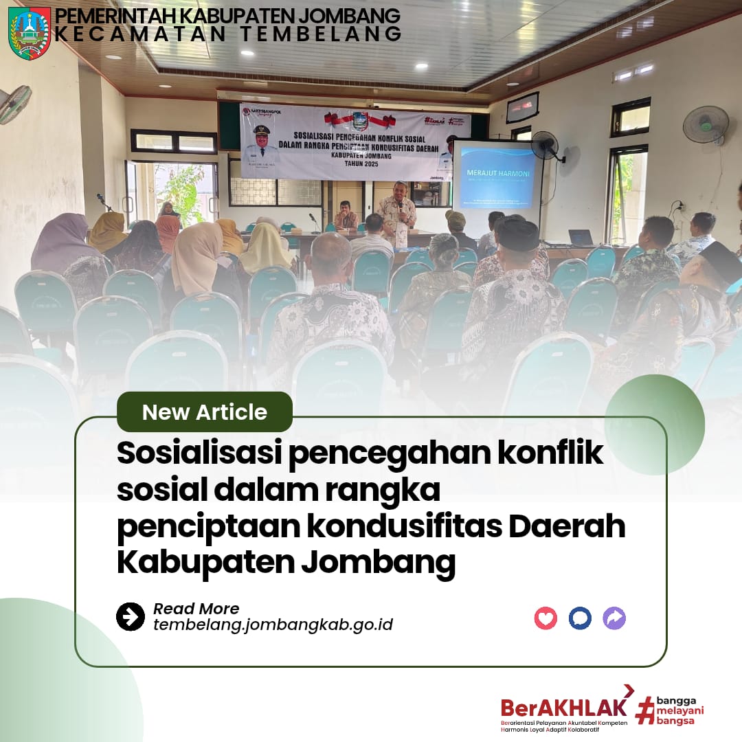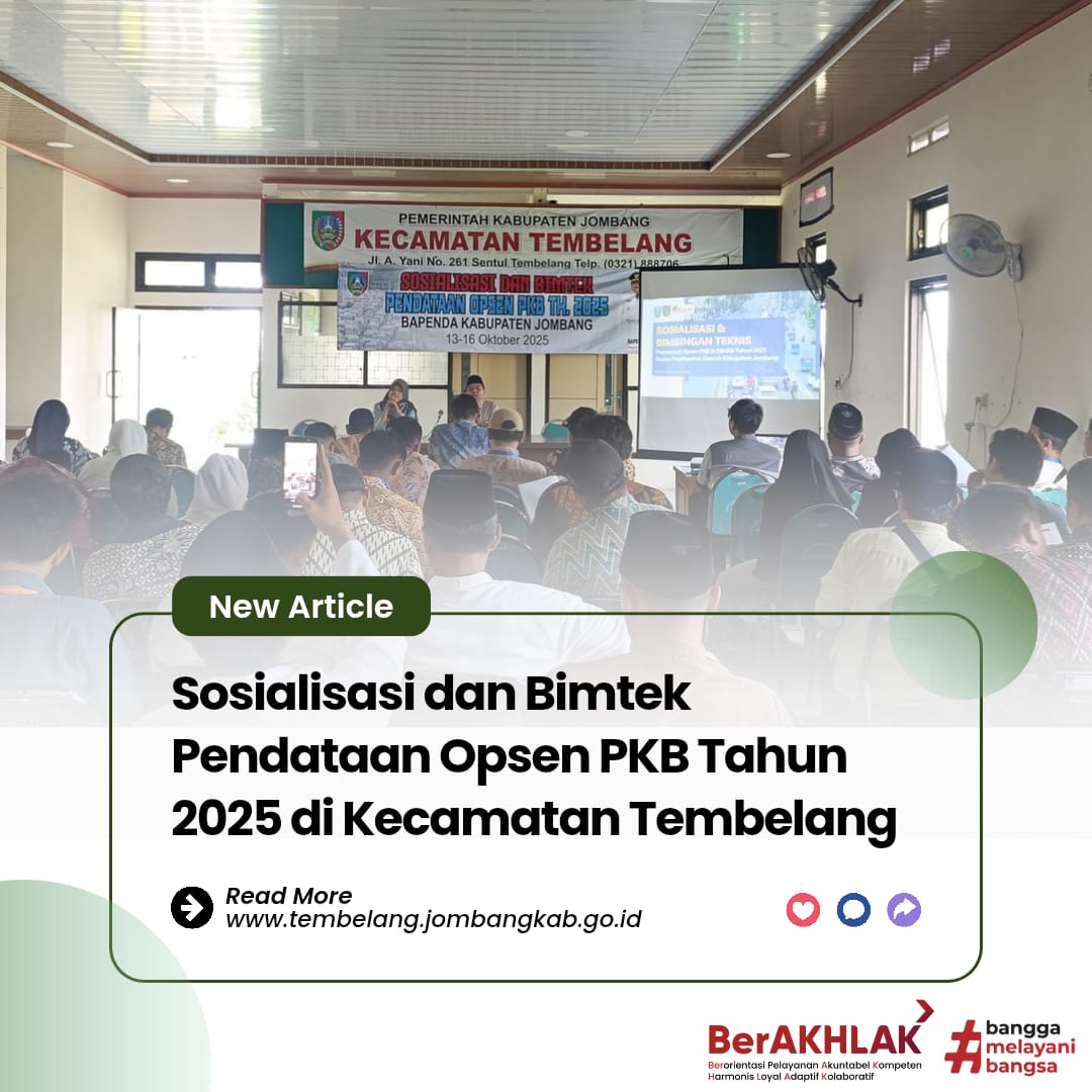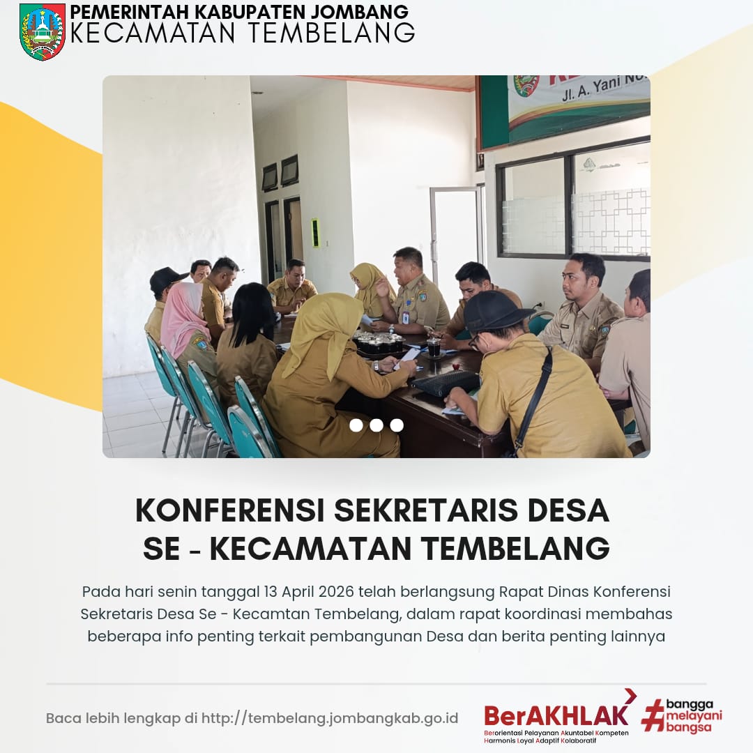 Assalamu’alaikum WR.WB Alhamdu lillahi rabbil ‘alamin, dengan mengucapkan puji dan syukur kehadirat Allah SWT serta berkat rahmat dan hidayahnya sehingga kita memperoleh kenikmatan yang tiada tara yaitu nikmat iman dan nikmat Islam serta juga nikmat kesehatan dan kesempatan sehingga bisa menikmati kehidupan sampai dengan saat ini. Shalawat dan salam tak lupa pula untuk tetap saling kita sanjung sajikan ke baginda Rasulullah Muhammad SAW beserta keluarga dan sahabat beliau sekalian. Peluncuran website ini bertujuan untuk mempublikasikan informasi dan dokumentasi Kecamatan Tembelang khususnya tentang pelayanan publik, pemerintahan dan pembangunan. Oleh karena itu dengan memanfaatkan sarana teknologi informasi yang ada dan sebagai bentuk pelayanan melalui keterbukaan informasi publik kepada masyarakat, Website Kecamatan Tembelang hadir sebagai penyampai informasi serta pelayanan publik yang kini sudah dapat di akses melalui internet, kami berusaha mewujudkan hal tersebut semaksimal mungkin. Semoga dengan adanya website ini dapat membantu dan bermanfaat, terutama informasi yang berhubungan dengan pemerintahan dan pembangunan Kecamatan Tembelang khususnya. Besar harapan kami, sarana ini dapat memberi manfaat bagi semua pihak yang ada di lingkup Kab. Jombang khususnya Tembelang. Tentunya kami menyadari bahwa website yang kami sajikan ini jauh dari kesempurnaan, baik itu dari segi tampilan ataupun dari segi penyajian informasi dan lain sebagainya tentu belum bisa memuaskan semua pihak, untuk itu kami mohon masukan, saran dan kritikan yang membangun demi terpenuhi kesempurnaan Website Kecamatan Tembelang yang kami sajikan ini serta agar kami bisa terus belajar dan meng-update diri, sehingga tampilan, isi dan mutu website yang kami sajikan ini akan terus berkembang dan lebih baik nantinya. Terimakasih. Wassalamu'alaikum WR.WB