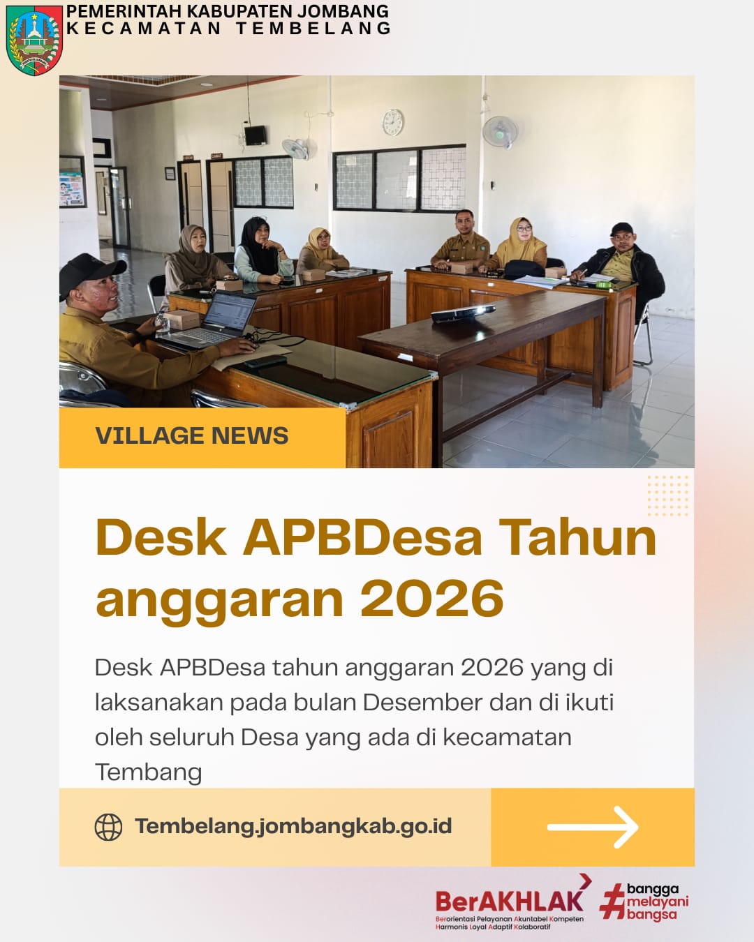 Kantor Kecamatan Tembelang melaksanakan kegiatan Desk APBDesa Tahun Anggaran 2026 yang diikuti oleh seluruh desa yang ada di wilayah Kecamatan Tembelang. Kegiatan ini berlangsung selama enam hari, mulai tanggal 18 hingga 23 Desember, bertempat di Kantor Kecamatan Tembelang.