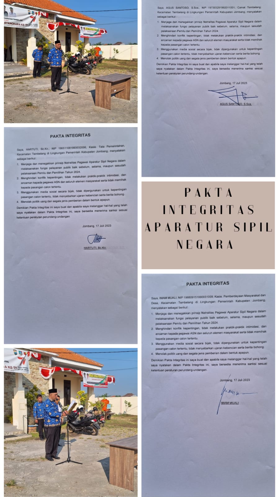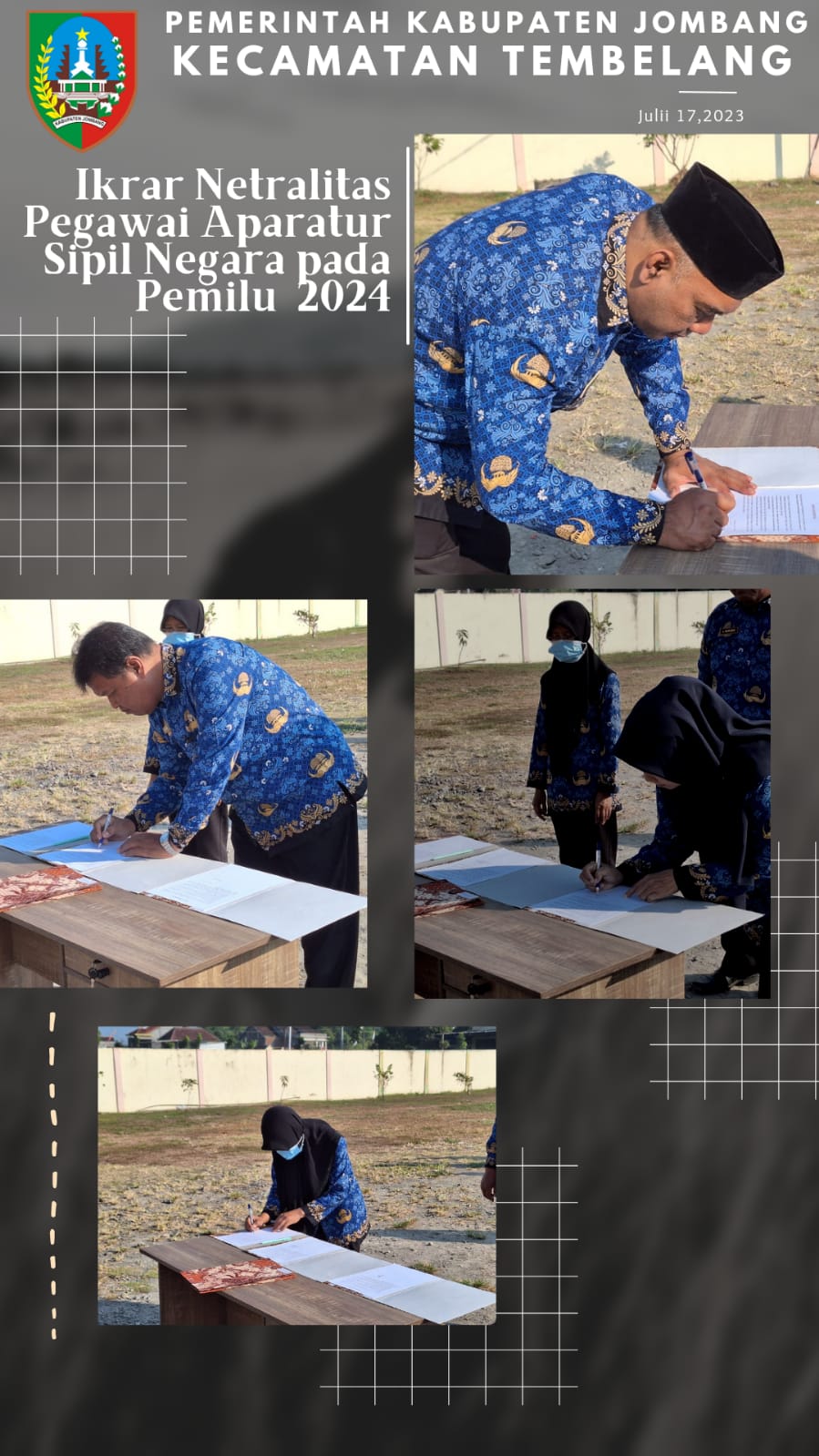 Pembacaan Ikrar Netralitas dilakukan oleh Camat Tembelang Agus Santoso, S.Sos. Setelah itu dilanjutkan dengan penandatangan pakta integritas oleh seluruh ASN di Kecamatan Tembelang. Kegiatan ini bertujuan untuk mewujudkan pegawai ASN Lingkup Kecamatan Tembelang Kabupaten Jombang yang netral dan profesional serta terselenggaranya Pemilihan Umum dan Pemilihan Tahun 2024 di Kabupaten Jombang yang berkualitas.