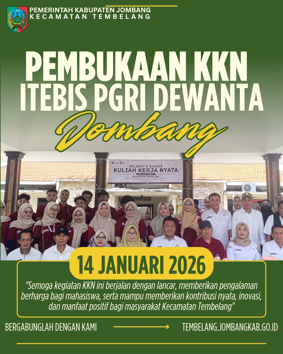 Kecamatan Tembelang menjadi lokasi pembukaan Kuliah Kerja Nyata (KKN) ITEBIS PGRI Dewantara Jombang yang dilaksanakan pada Rabu, 14 Januari 2025. Kegiatan ini secara resmi dibuka oleh Camat Tembelang, Bapak Fahruddin Fauzi, SE., MM, dan dihadiri oleh jajaran perangkat kecamatan serta civitas akademika ITEBIS PGRI Dewantara Jombang.